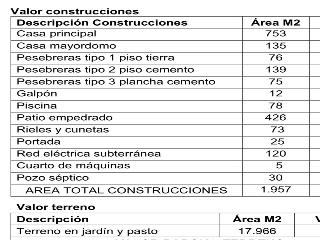 CM - 9921917 * GPV -VENTA - Espectacular propiedad campestre diseñada para ofrecer el máximo confort, combinando espacios generosos con una distribución pensada para la elegancia, el descanso y la funcionalidad. Especificaciones Generales La propiedad cuenta con un extenso lote total de 17.966 m², compuesto por terreno en jardín y pasto, y un área total construida de 1.957 m². Casa Principal (753 m²) En su zona privada, la residencia ofrece 4 habitaciones de gran formato, cada una equipada con vestier independiente y baño privado. Su zona social destaca por un amplio salón-comedor principal y un salón-biblioteca independiente, perfectamente acondicionado como sala de televisión. La cocina es integral y moderna, cuenta con isla central y está equipada con lavaplatos automático y máquina de hielo; además, posee una despensa principal para alimentos y una alacena auxiliar exclusiva para el resguardo de la vajilla. Las áreas de servicio incluyen una zona de ropas independiente, dotada de lavadora y secadora, junto con una amplia habitación de servicio con baño privado y capacidad para dos camas. Instalaciones Exteriores y Amenidades Para el entretenimiento, ofrece una extraordinaria terraza al aire libre con área de BBQ y una piscina privada de 78 m², complementada por un imponente patio empedrado de 426 m². Adicionalmente, la finca cuenta con una casa de mayordomo independiente de 135 m² y completas instalaciones ecuestres y agropecuarias que incluyen un galpón de 12 m² y tres tipos de pesebreras (con piso de tierra, piso de cemento y plancha de cemento) que suman en total 290 m². Infraestructura Para garantizar un funcionamiento impecable, la propiedad dispone de red eléctrica subterránea de 120 m², vías de acceso internas con rieles y cunetas de 73 m², una elegante portada principal de ingreso de 25 m², un cuarto de máquinas de 5 m² y pozo séptico de 30 m². Valor de Inversión: $6.000.000.000 COP.